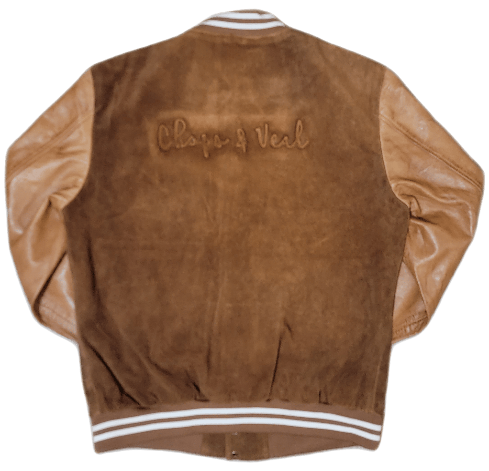 Brown Suede body, Brown Leather arms, Brown/Cream Trim, Embossed Chops & Veal Signature on back